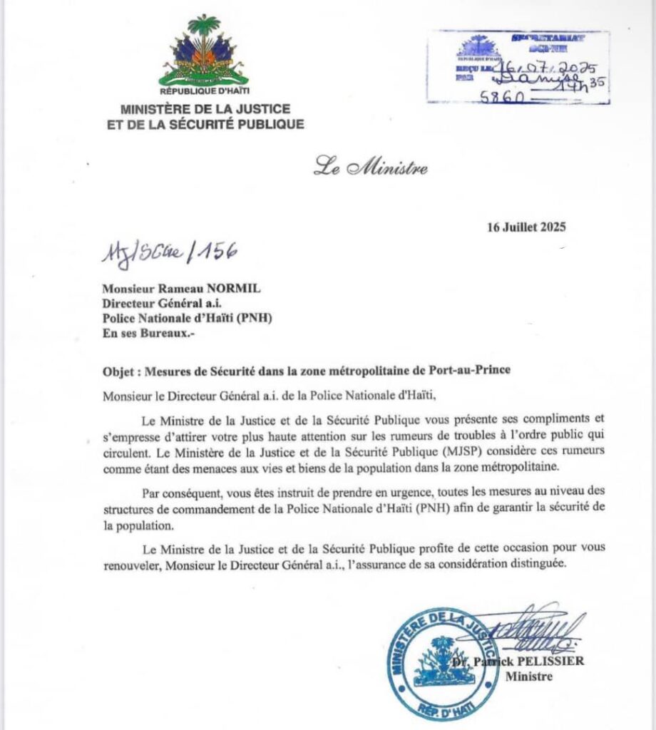 Dans une correspondance officielle datée du 16 juillet 2025, le Ministre de la Justice et de la Sécurité Publique (MJSP), Me Patrick Pélissier, a adressé une note urgente au Directeur Général a.i. de la Police Nationale d’Haïti (PNH), M. Rameau Normil, au sujet de rumeurs persistantes concernant des troubles imminents à l’ordre public dans la zone métropolitaine de Port-au-Prince.