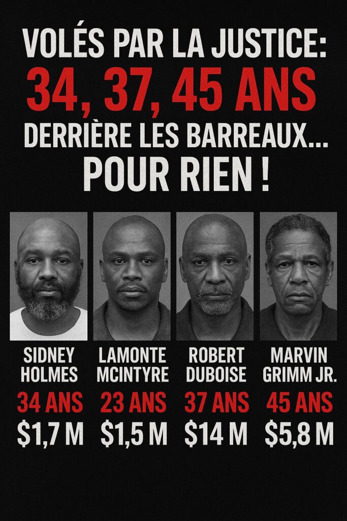 Sidney Holmes, Lamonte McIntyre, Robert DuBoise, Marvin Grimm Jr. — quatre visages, quatre vies brisées, quatre hommes noirs pris dans l’engrenage d’une justice qui prétend être aveugle, mais dont le bandeau laisse passer la couleur de peau. Tant que la société américaine ne reconnaîtra pas le rôle central du racisme dans ses erreurs judiciaires, ces tragédies continueront… et les noms ne cesseront de s’ajouter à la liste.